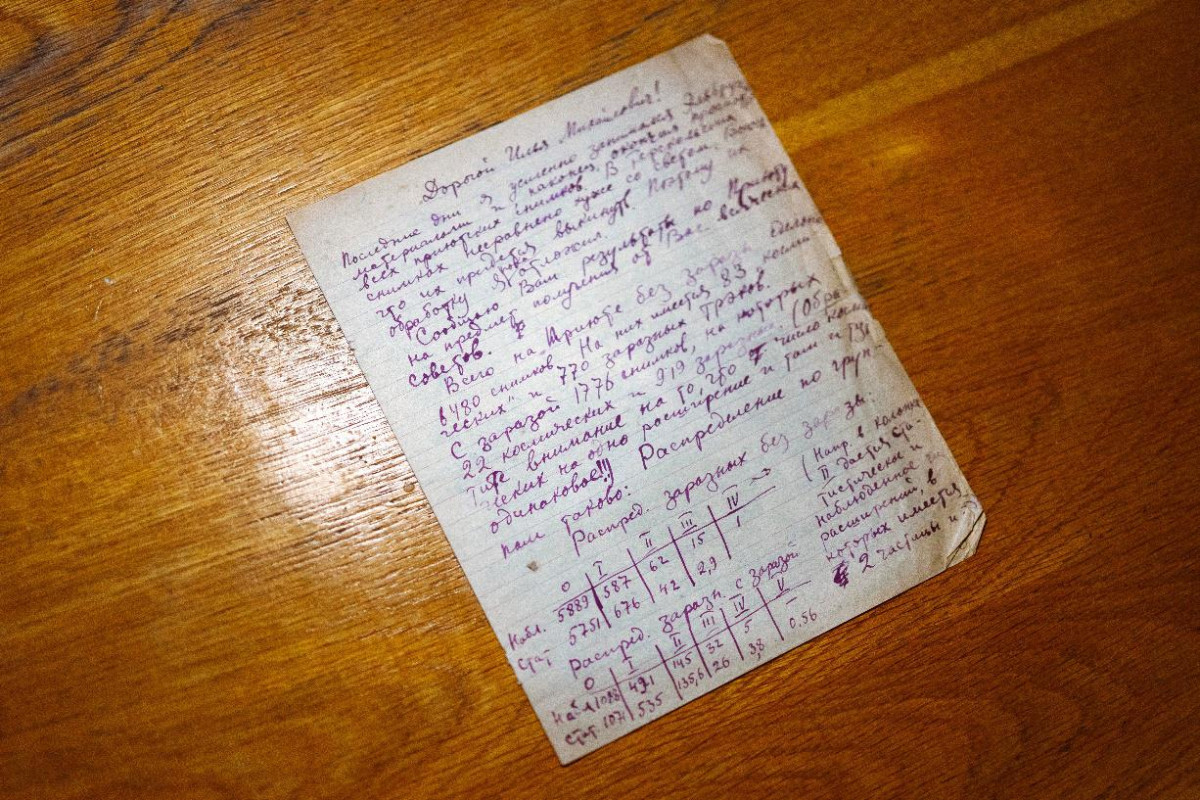 Фрагмент письма: «…С заразой 1776 снимков, на которых 22 космических и 919 заразных. (Обратите внимание на то, что число космических на одно расширение и там и тут одинаковое!!) Распределение по группам таково… ». Исторический архив ОИФИ, Фонд Франка И.М., Оп. 4, Д. 9.