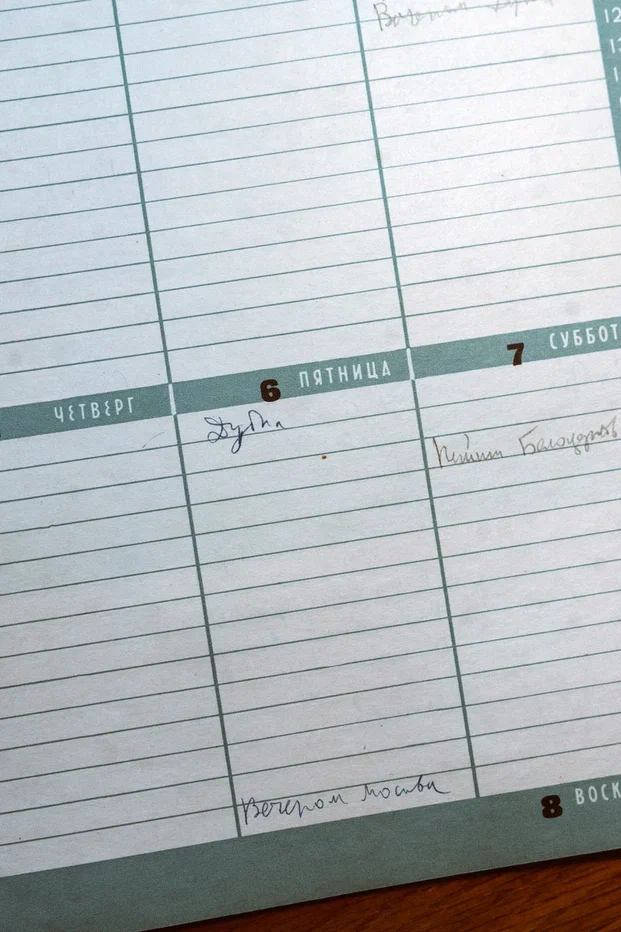 Еженедельник И.М. Франка за 1964 г., запись от 6 марта: «Дубна» утром в пятницу. Ниже – «Вечером Москва». Исторический архив ОИЯИ, Фонд Франка И.М., Оп. 2, Д.3.