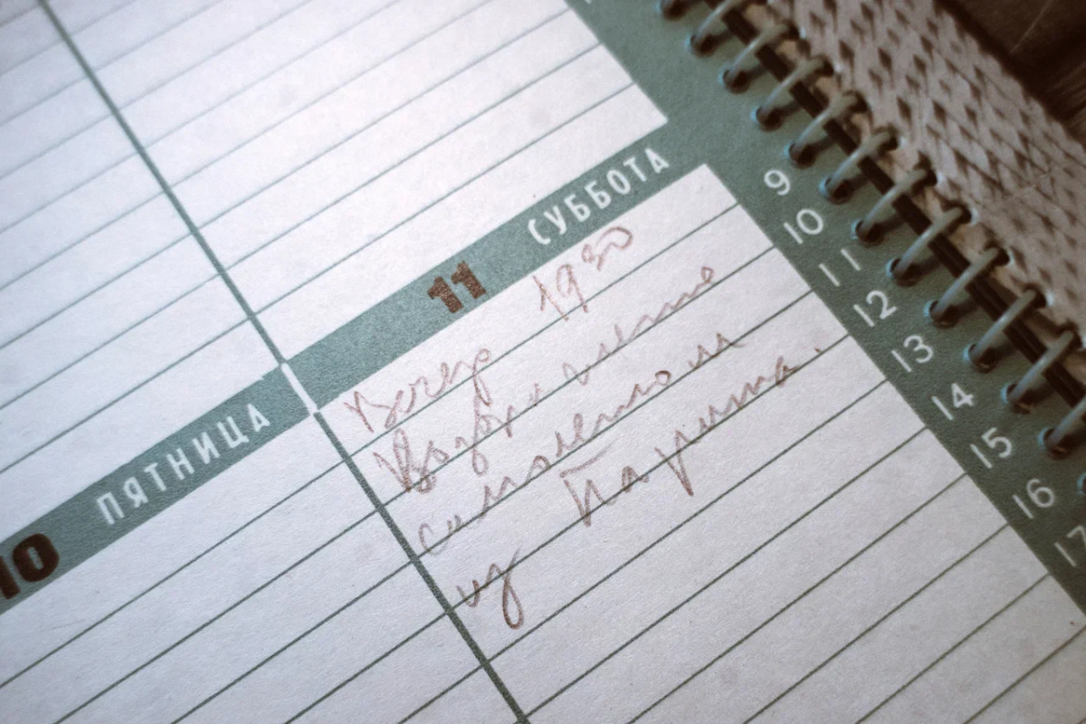 Еженедельник И.М. Франка за 1964 г., запись на 13 февраля: «Днем вылет / Тбилиси / Тбилиси / Гостиница Абхазия / №348». Соседняя запись на 14 февраля: «Тбилиси / Осмотр города. / Открытое совещание». Исторический архив ОИЯИ, Фонд Франка И.М., Оп. 2, Д.3.